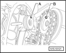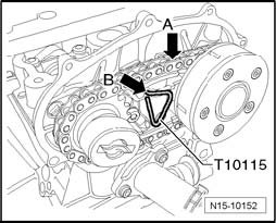- Compress chain tensioner - arrow A - and secure it using Locking Pin T10115 - arrow B -.