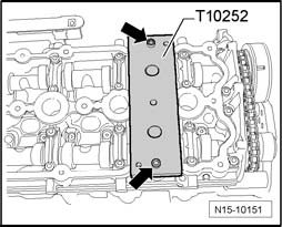 ^ The camshafts must be fixed in place with camshaft locating tool T10252.