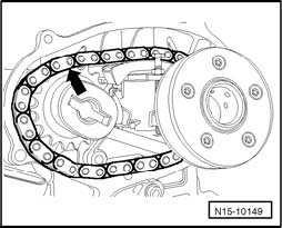 - Place chain in this position on to chain sprocket of intake camshaft, first at top - arrow -.