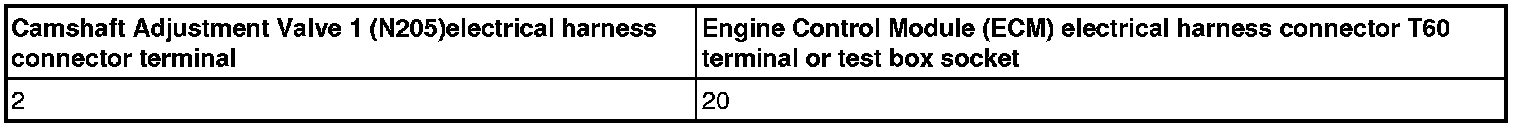 - Using a Multimeter, Check the Camshaft Adjustment Valve 1 (N205) electrical harness connector terminal 2 to the Engine Control Module (ECM) electrical harness connector T60 terminal 20 for resistance.