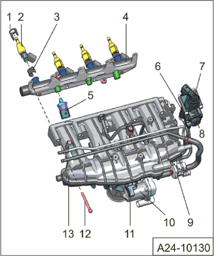 - The intake manifold runner position sensor G336 item 10 must be adapted to the engine control module J623 after removing or replacing the intake manifold vehicle diagnosis, testing and information system VAS 5052 "Guided Function".