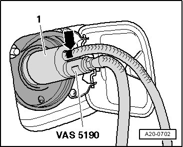 - Install the shaft piece - 1 - for the Fuel Extracting Device (VAS 5190) on the fuel tank filler tube.