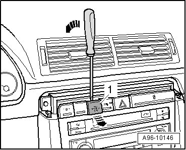 - Carefully pry out lever out indicator lamp - 1 - from switch mounting - arrows - using a flat screwdriver.