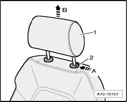 - Push release button - 2 - in - direction of arrow A - and pull headrest - 1 - upward as far as possible - arrow B -, keep release button pushed while doing so.