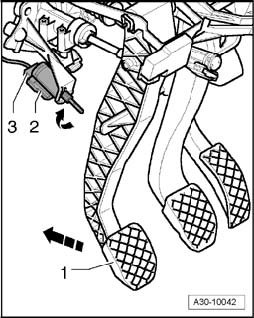 ^ The clutch pedal - 3 - is in the normal position (i.e. not pressed down). The operating rod - arrow - of the clutch pedal switch F36 should then rest against the clutch pedal.