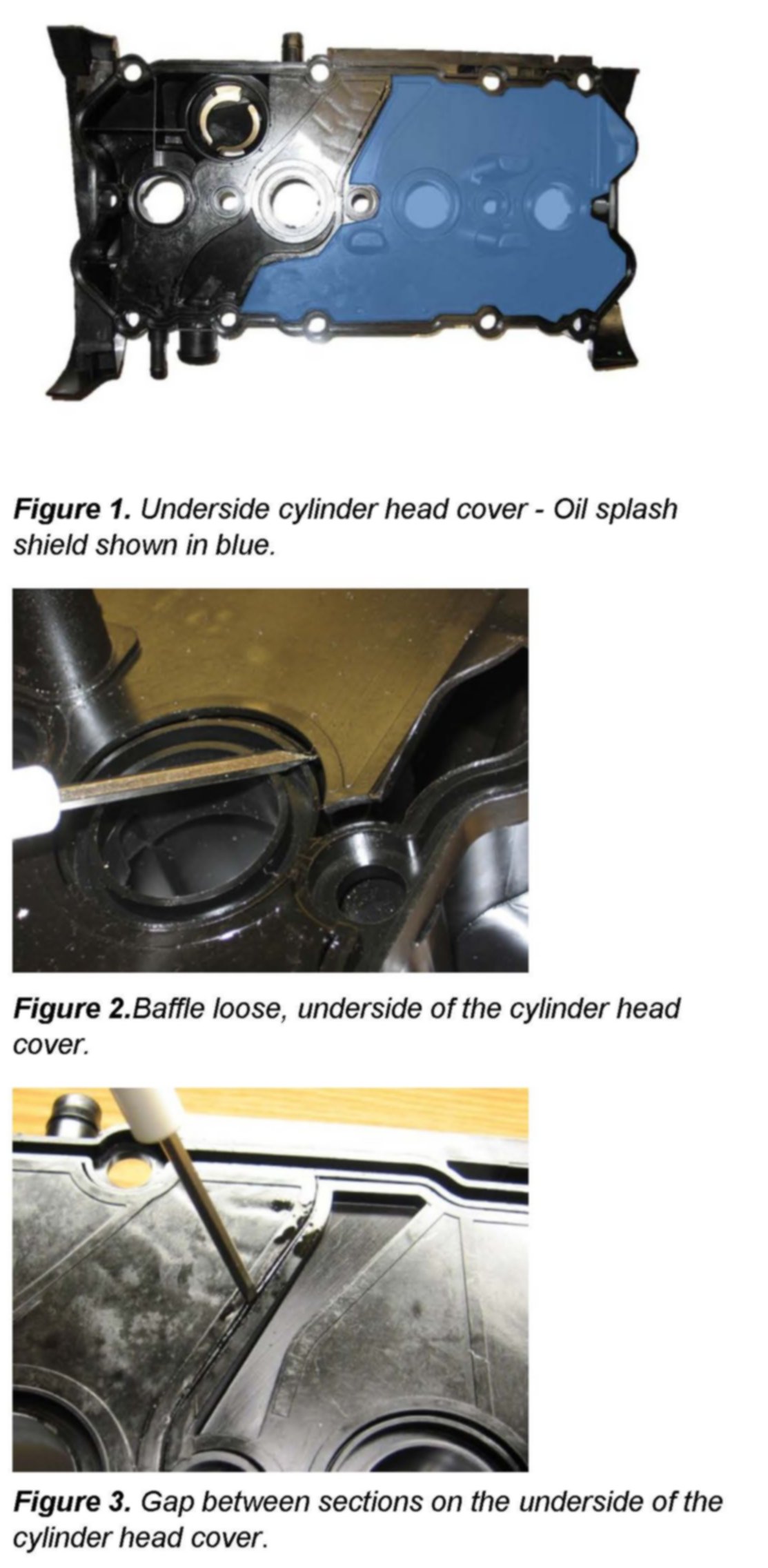 The plastic welded sections of oil splash shield part of the cylinder head cover (Figure 1, blue area) may have gaps between them at the weld point, or may feel loose (Figure 2 and Figure 3). Extensive testing has confirmed that this condition does not cause any problems and is not a defect.