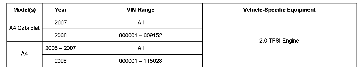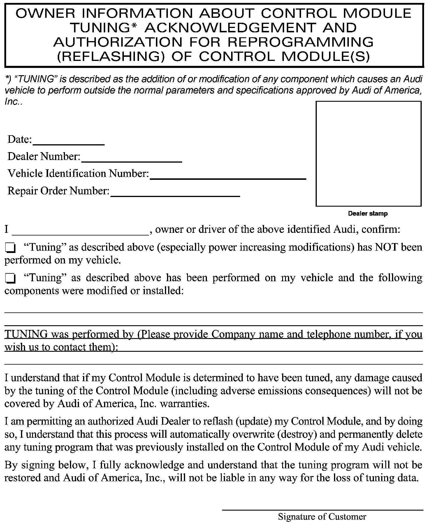 Any Update Programming procedure (flash) may overwrite any tuned ECM or TCM programming. A tuned ECM or TCM is described as any ECM or TCM altered so as to perform outside the normal parameters and specifications approved by Audi of America, Inc.