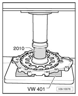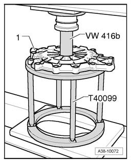 - Lay input shaft cover - 1 - on pressure stand T40099 and place under hydraulic press.