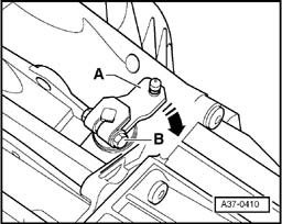 - Press selector shaft lever - A - on transmission completely toward rear - arrow - until parking lock engages.