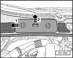 - Slide cover over battery to right - arrow 1 - and pull it off upwards - arrow 2 -.