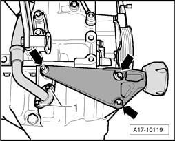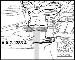 - Place plunger of Engine/Transmission Jack V.A.G 1383 A with a block of wood inserted in between - 1 - on transmission at bottom.