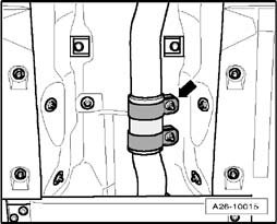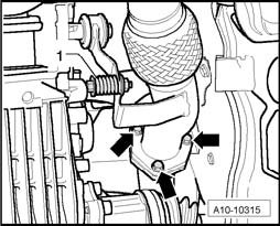 - On vehicles equipped with auxiliary heater, remove bolts - arrows - for exhaust pipe of auxiliary/additional heater to noise insulation.