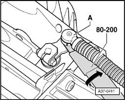 - Using pry lever 80-200, press selector lever cable - A - from lever for selector shaft - arrow -.