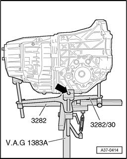 - Mount transmission support 3282 on Engine/Transmission Jack V.A.G 1383 A.
