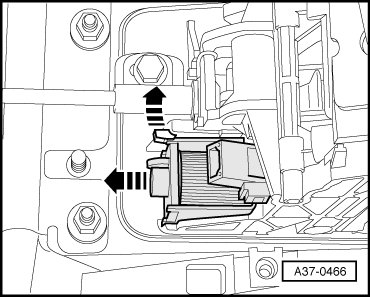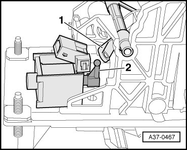 - Press the shift lock solenoid into the guide until it engages; the operating lever - 2 - of the solenoid must engage in the locking lever - 1 - on the shift mechanism.