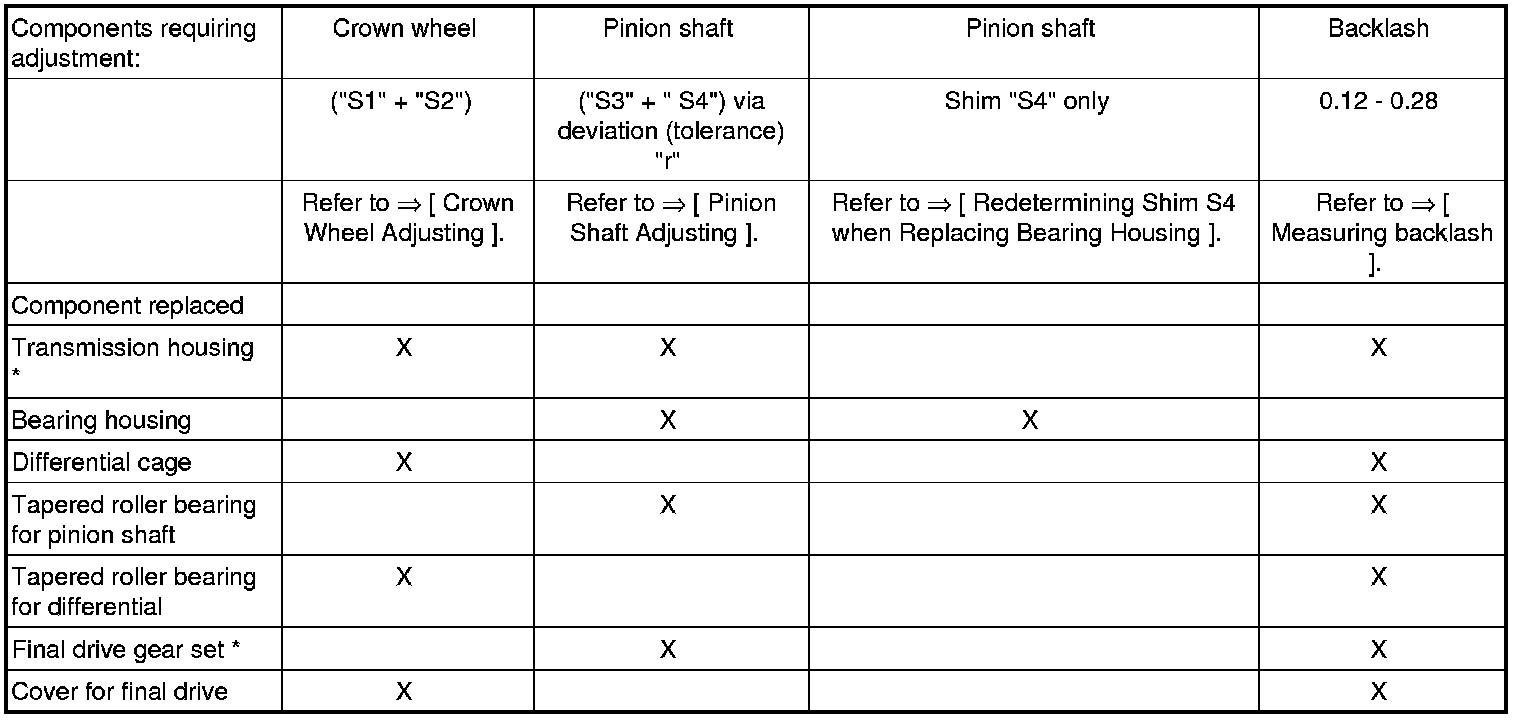 • If repairs have been perform to the transmission, it is only necessary to adjust the pinion shaft, crown wheel or final drive set if components have been replaced which have a direct effect on the adjustment of the final drive. Refer to the following table to avoid unnecessary adjustment work: