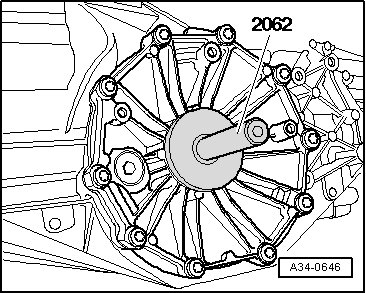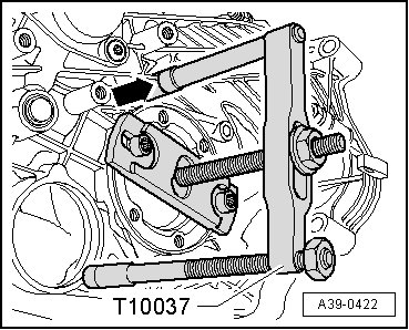 - Remove flange shaft (right side); by securing puller (T10037) to transmission housing - arrow -.
