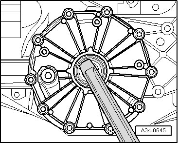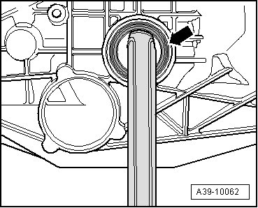 - Pry out flange shaft oil seal - arrow - using an assembly lever.