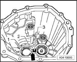 - Insert retaining plate - 2 - with high shoulder - arrow - facing needle bearing - 1 - into transmission cover.