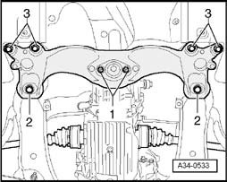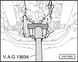 - Use engine/transmission jack V.A.G 1383 A to lift transmission up slightly. Insert a wooden block - 1 - between transmission and transmission jack.