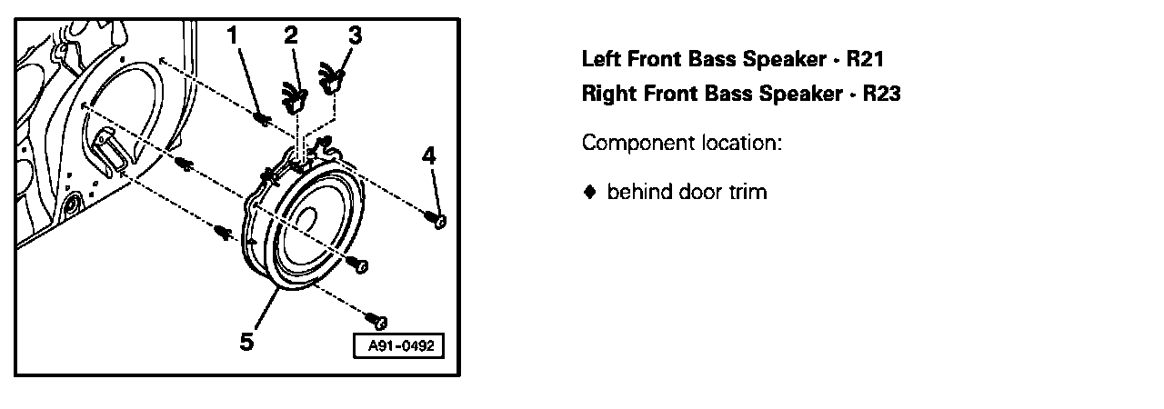 Left Front Bass Speaker R21, Right Front Bass Speaker R23: