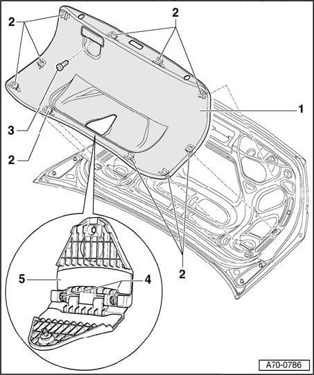 - Loosen ten clips - 2 - on rear lid trim and unclip them from below.