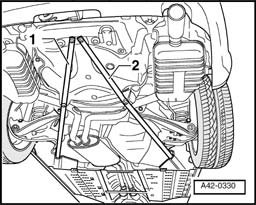 - Mark location of hydraulic mounting - 1 - to subframe - 2 -, e.g. with a felt-tip pen (Fig. shows subframe on front wheel drive vehicle).