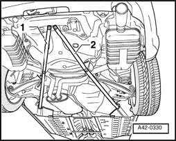- Position engine and transmission jack V.A.G 1383 A with universal transmission support V.A.G 1359/2 and a corresponding wooden block at subframe or final drive (Fig. for vehicles with front wheel drive).