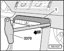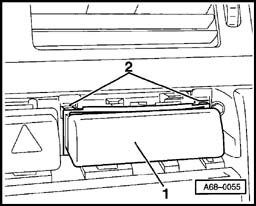 - Insert radio release tool T10057 at catches - 2 - (2x) and remove cup holder or storage compartment - 1 -.