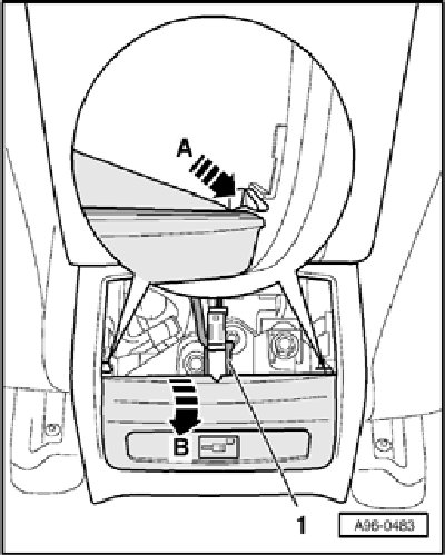 - Press retaining hooks - arrow A - on left and right outwards and swivel switch mounting to rear - arrow B -.