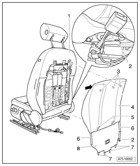 - In the illustration, removal and installation of backrest cover is shown on a front seat with the active head restraint system.