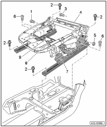 - After loosening bolts - 6 -, lower part of seat pan - 7 - including Seat Fore/Aft Adjustment Motor V288 must be replaced with transverse member - 9 -.