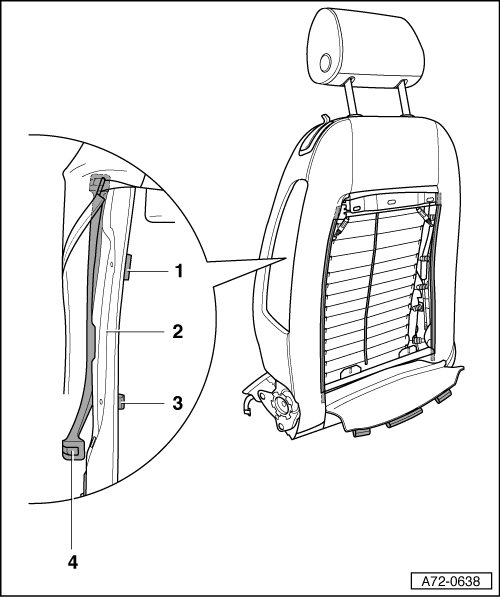 - Press the clip - 3 - together and remove it from the inside out of the backrest frame - 2 -.