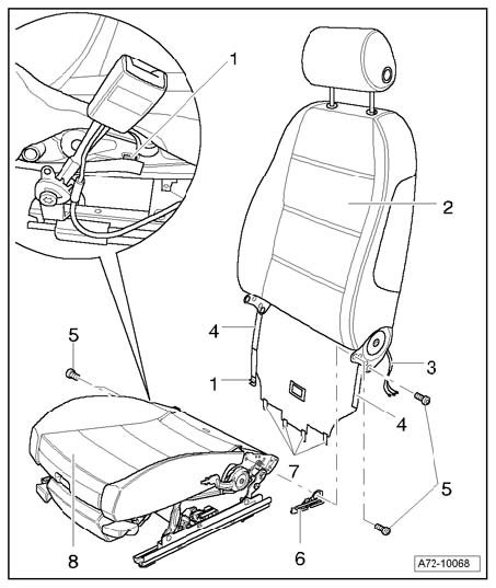 - Disengage retaining strip - 1 - from seat pan - 8 -.