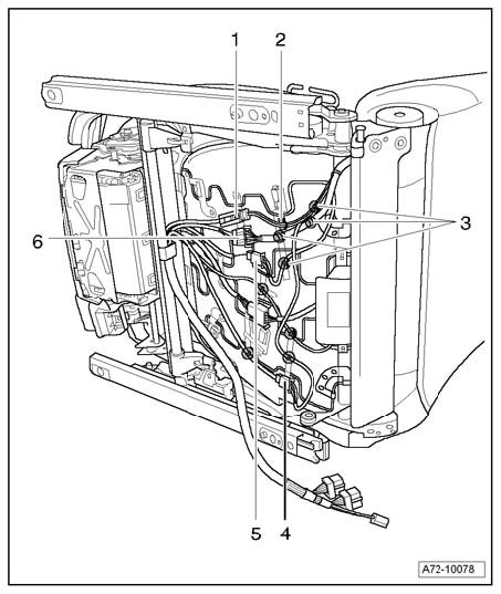 - Push cushion aside and carefully disconnect wiring harness - 3 - from seat pan - 8 -.