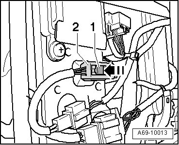 - Press catch - 1 - in direction of arrow and disconnect connector for side airbag - 2 -.