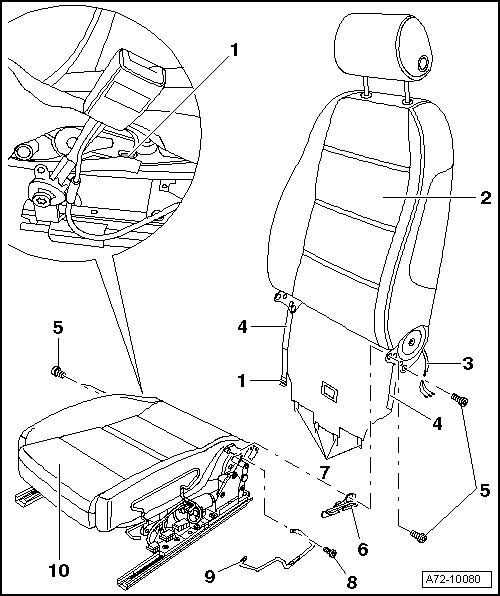 - Disengage retaining strip - 1 - from seat pan - 10 -.
