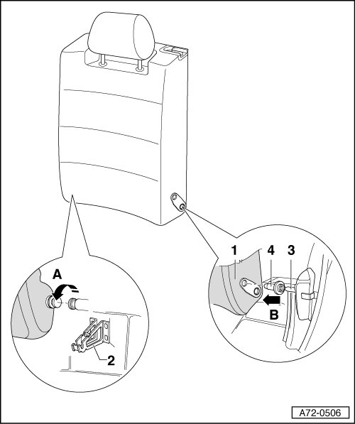 - Lift backrest - 1 - from center support - 2 - in direction of arrow - A - and detach from fitting - 3 - in direction of arrow - B -.