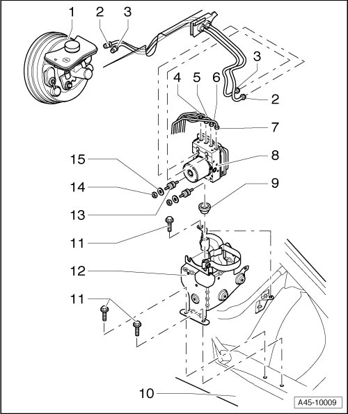 • Removing and installing, refer to => [ Hydraulic Control Unit, Bosch 5.7 ] Hydraulic Control Unit, Bosch 5.7.