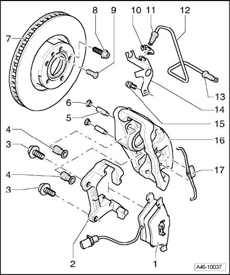 ^ Before installing the brake pads, clean guide surfaces and apply a thin coating of polycarbamide grease G 052 142 A2.