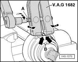 - Position CV Joint Boot Clamp Tool VAG 1682 as shown in illustration. Make sure that the jaws of tension clamp seat in corners - arrows B - of hose clip.