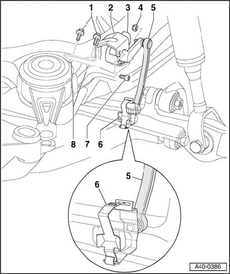 When removing and installing control arm, it is necessary to loosen Left Front Level Control System Sensor G78 retaining clip.