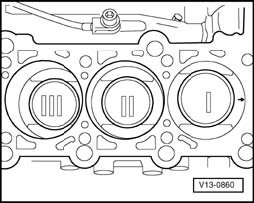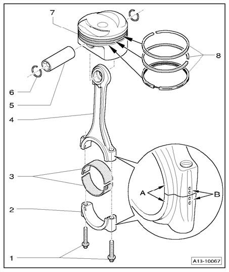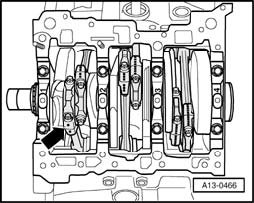 - Before removing, mark allocation of connecting rod and connecting rod bearing caps to each other and to cylinder with paint - arrow -.