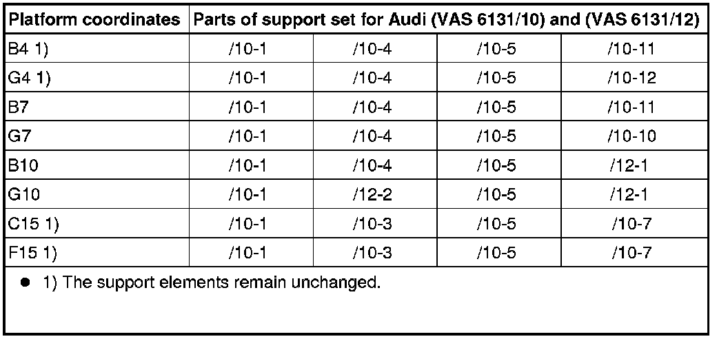 - Equip scissor lift platform (VAS 6131 A) with support set for Audi (VAS 6131/10) and (VAS 6131/12) as follows: