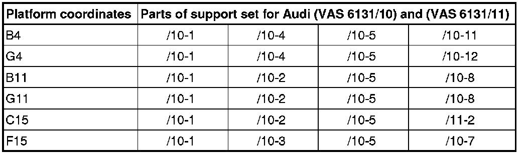 - Equip scissor lift platform (VAS 6131 A) with support set for Audi (VAS 6131/10) and (VAS 6131/11) as follows: