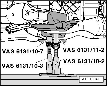 - Position support elements from (VAS 6131/10) and (VAS 6131/11) at left and right on tunnel cross member as shown in illustration.