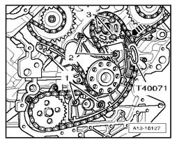 - Pull out securing pin T40071 to release chain tensioner.