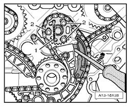 - Press against chain tensioner guide rail - arrow - with screwdriver and simultaneously fasten bolts -2- for sprocket.