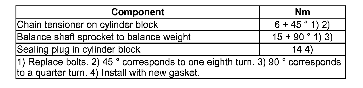 - Remove bolts - 1 through 3 - and remove chain tensioner, balance shaft sprocket and chain.