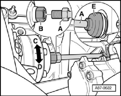 - After loosening threaded connection, drive shaft - A - can be pushed through socket - E - into drive pinion.